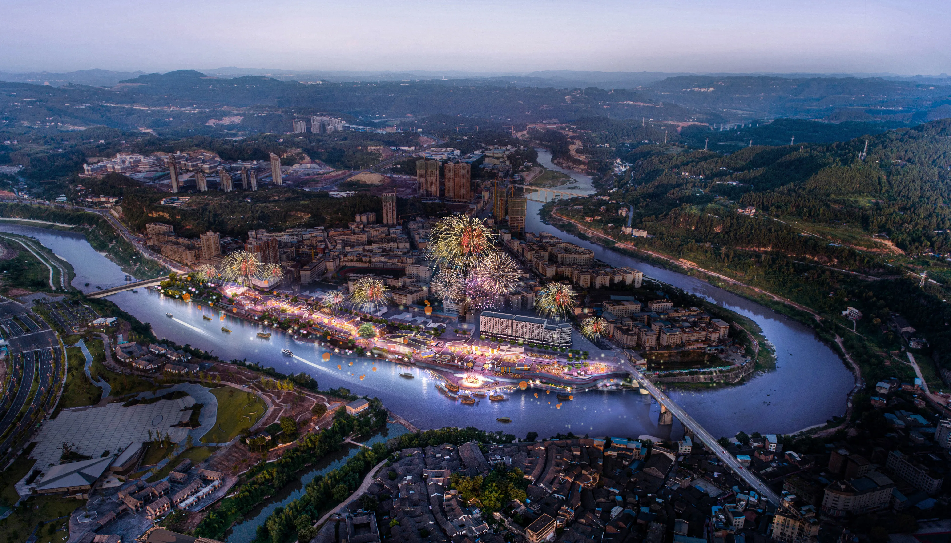 其中,無人機(jī)表演作為開街重點(diǎn)活動,在夜幕降臨時,1500架無人機(jī)編隊騰空而起,在仿古建筑群和恩陽河畔上空變換隊形,形成不同的特定圖案,將開街氛圍推向高潮,呈現(xiàn)出一場“人在畫中游、畫在景中走”的交互沉浸式場景。