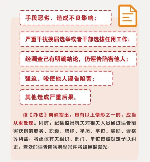 《辦法》指出,對(duì)于故意誣告陷害他人,致使他人受到不良政治影響、名譽(yù)損失或者責(zé)任追究的,一經(jīng)查實(shí),將依規(guī)依紀(jì)依法追究誣告陷害人的責(zé)任。是中共黨員和監(jiān)察對(duì)象的,將視情給予相應(yīng)的黨紀(jì)政務(wù)處分;是其他人員的,按有關(guān)規(guī)定移送公安機(jī)關(guān)或其他有關(guān)部門依法處理。對(duì)于匿名誣告陷害他人的違紀(jì)違法行為,經(jīng)市紀(jì)委監(jiān)委主要負(fù)責(zé)人批準(zhǔn)后,可采取核查筆跡、網(wǎng)絡(luò)IP地址等方式追查相關(guān)人員身份。