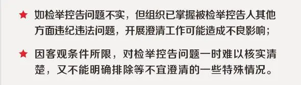 《辦法》也同時(shí)規(guī)定了一些不予澄清的情形。如檢舉控告問(wèn)題不實(shí),但組織已掌握被檢舉控告人其他方面違紀(jì)違法問(wèn)題,開(kāi)展澄清工作可能造成不良影響;因客觀條件所限,對(duì)檢舉控告問(wèn)題一時(shí)難以核實(shí)清楚,又不能明確排除等不宜澄清的一些特殊情況。